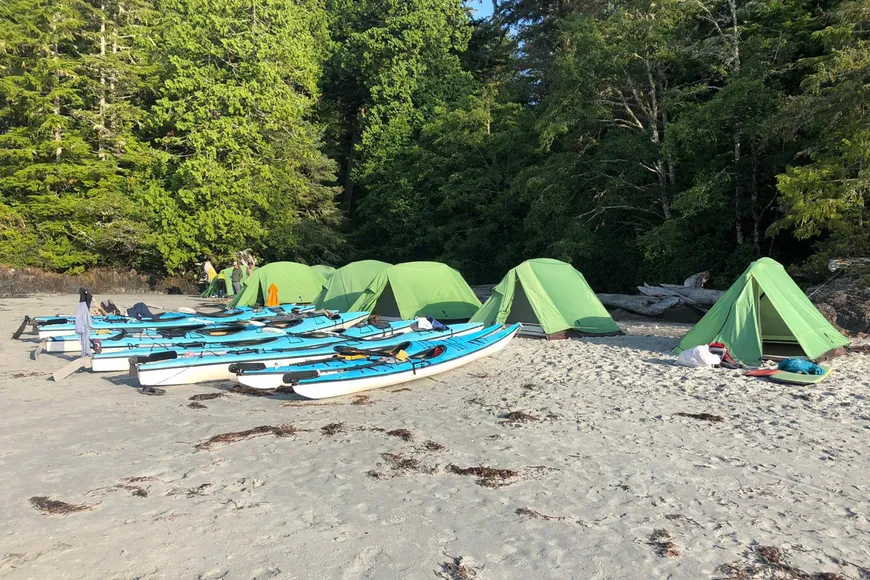 Bei Ihrem nächsten Abenteuer erforschen Sie im 2-Personen Ozeankajak die stillen Buchten und uralten Wälder des Clayoquot Sound. Erfahrung mit Kajaks ist nicht erforderlich. Bei Planung der Route werden Anfänger und auch Experten berücksichtigt, ein Kajak Guide für jeweils 6 Paddler. Am frühen Nachmittag geht es in Tofino los, auf Meares Island wird Pause gemacht. Bei einem kleinen Spaziergang unter Riesenzedern erzählt der Führer von der Geschichte dieser Insel. Dann paddeln Sie über eine Bucht, an einem Indianerdorf vorbei und sind am späten Nachmittag auf Vargas Island, Ihrem Ziel. Ein Zodiak liefert die Campingausrüstung und nimmt den Kajak Guide wieder zurück nach Tofino. Auf einem schönen Platz am Strand bauen Sie mit Ihrem Reiseleiter das Nachtlager auf. (Anstatt zu paddeln können Sie auch per Zodiak die Insel erreichen).