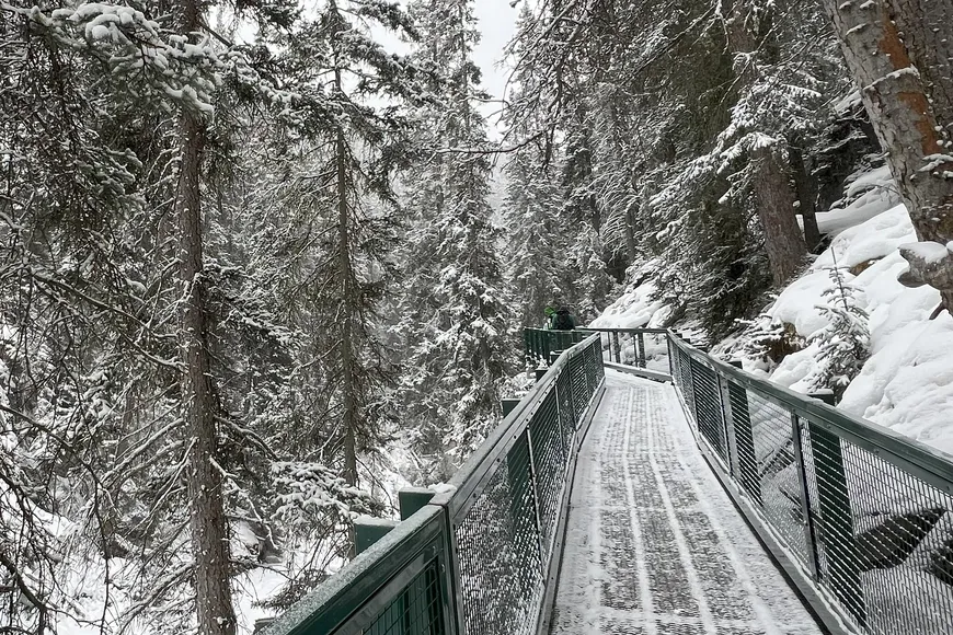 Heute braucht man Schneeschuhe (mit im Preis) für den Waldweg hinauf zum Aussichtspunkt über Lake Louise und dem prächtigen Luxus Chateau am Ufer. Wem es nach dieser 7 Km Wanderung mit 400 M Gewinn nicht warm genug ist, kann sich in einem der eleganten Restaurants des Chateaus verwöhnen lassen. Alternativ kann man Cross Country Skis mieten für die schönen Loipen entlang dem Seeufer.